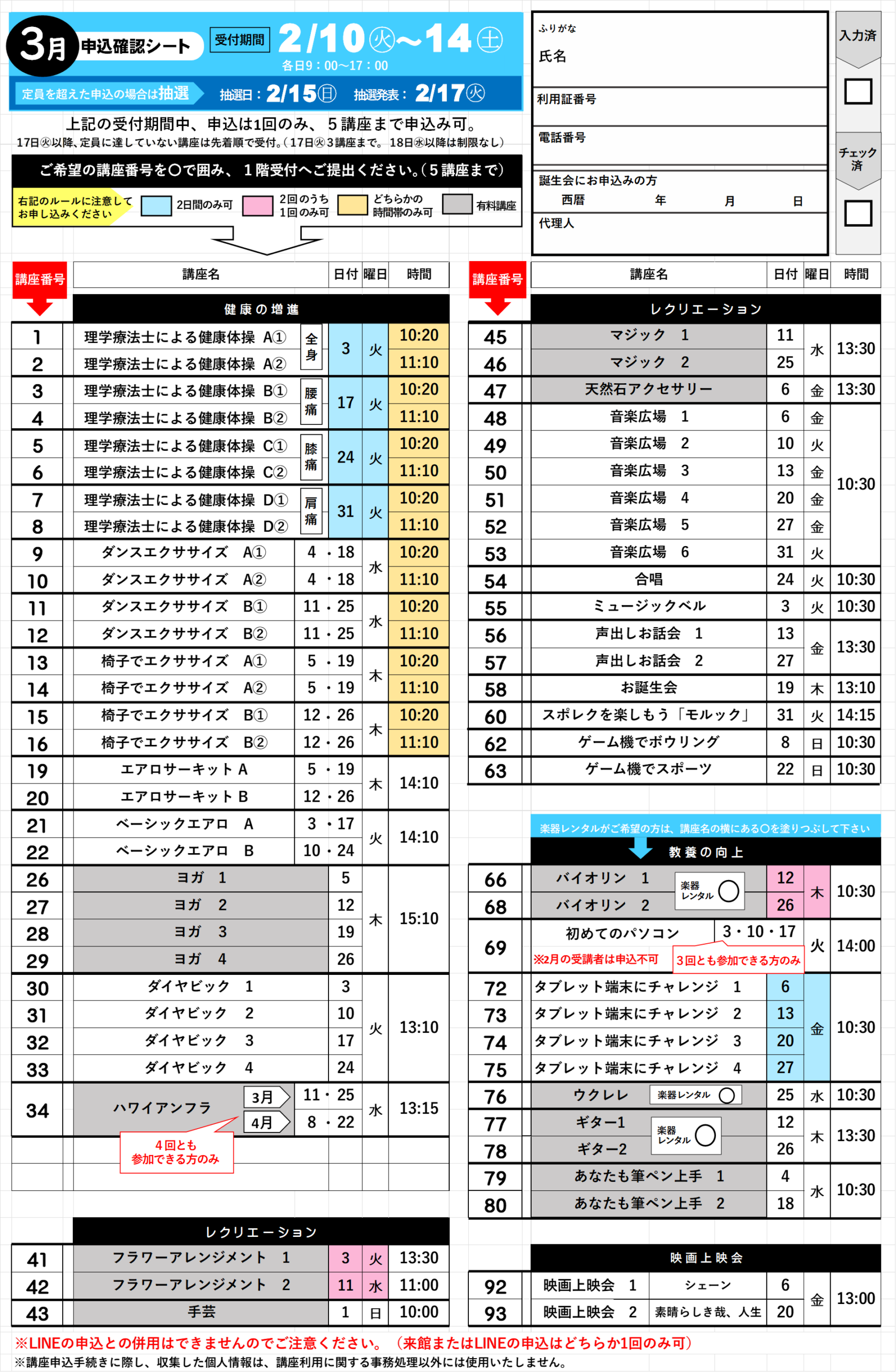 上記申込期間中に、専用の申込確認シートに5つまで希望する講座を選んで講座の番号に〇をして、1階受付までご提出ください。コピーをお渡ししますので、抽選結果と照らし合わせるまで大切に保管してください。