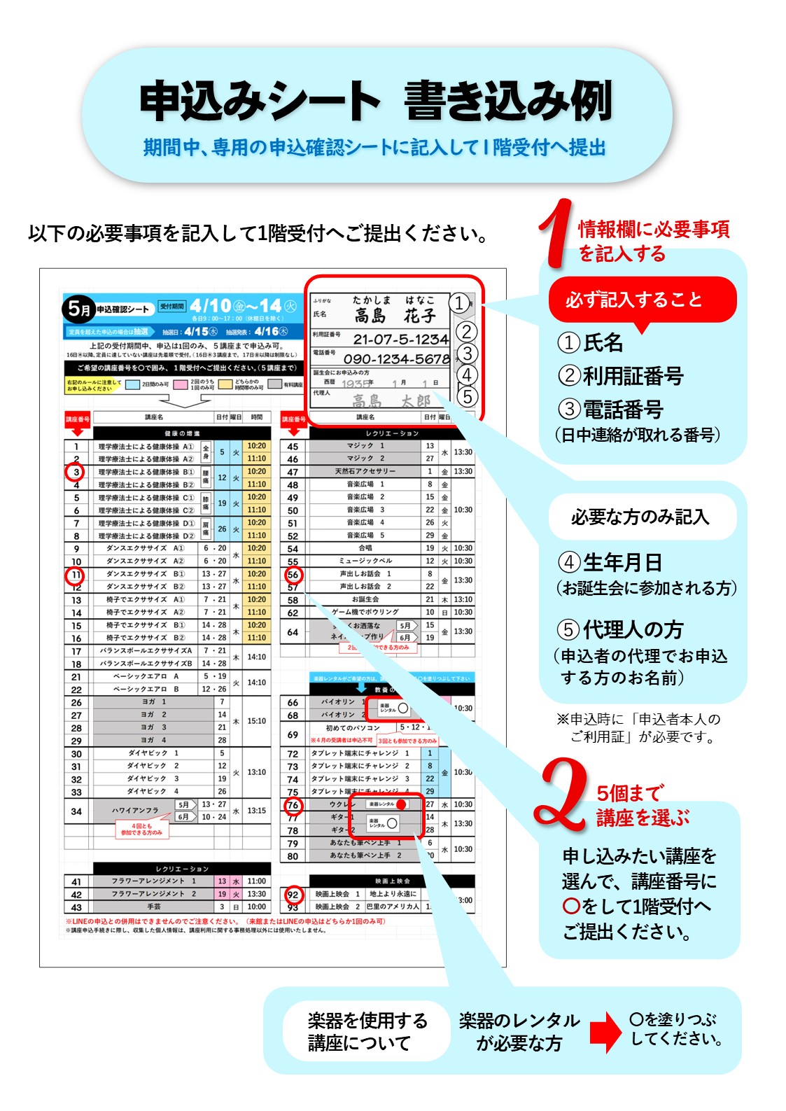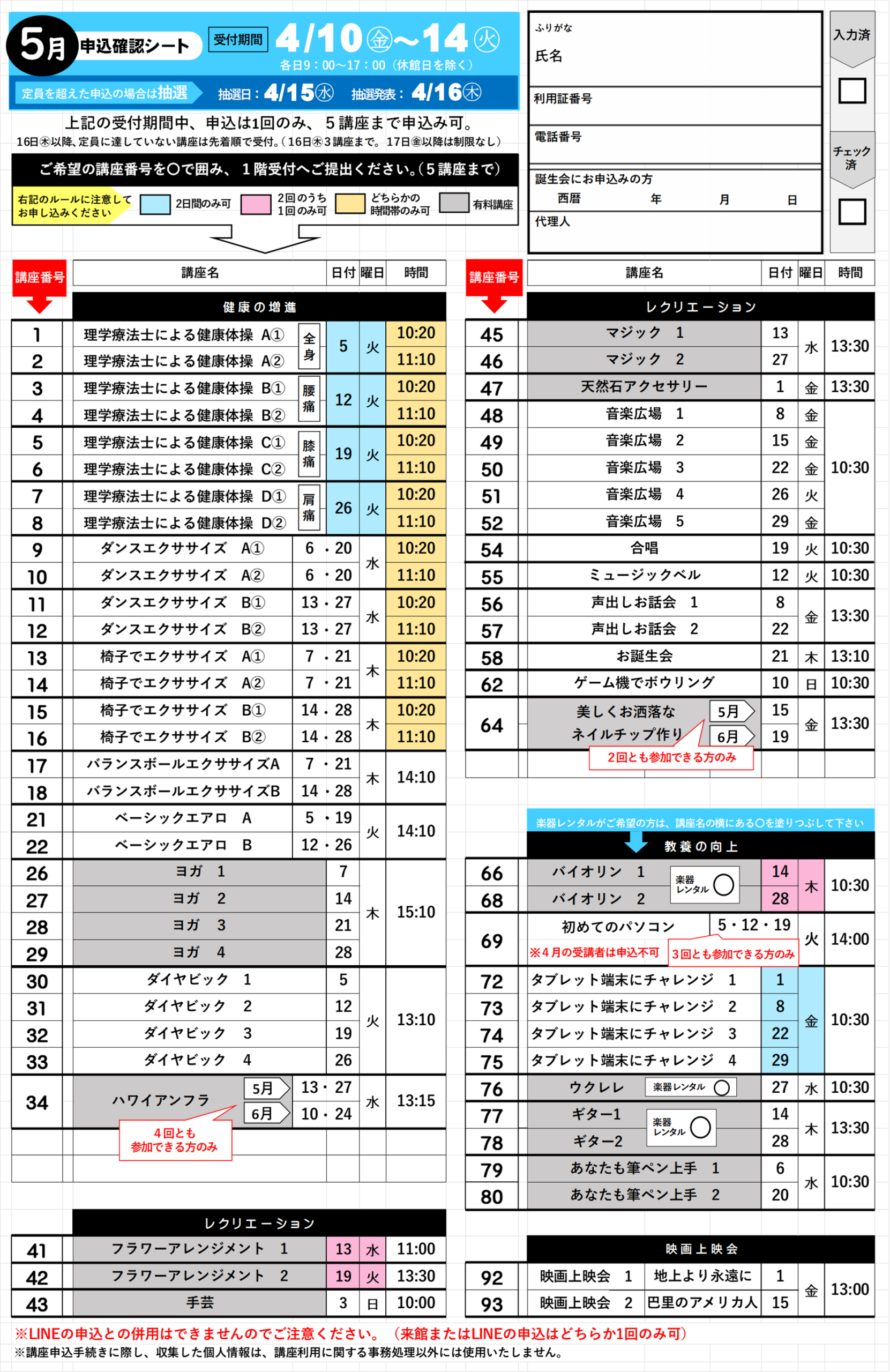 上記申込期間中に、専用の申込確認シートに5つまで希望する講座を選んで講座の番号に〇をして、1階受付までご提出ください。コピーをお渡ししますので、抽選結果と照らし合わせるまで大切に保管してください。