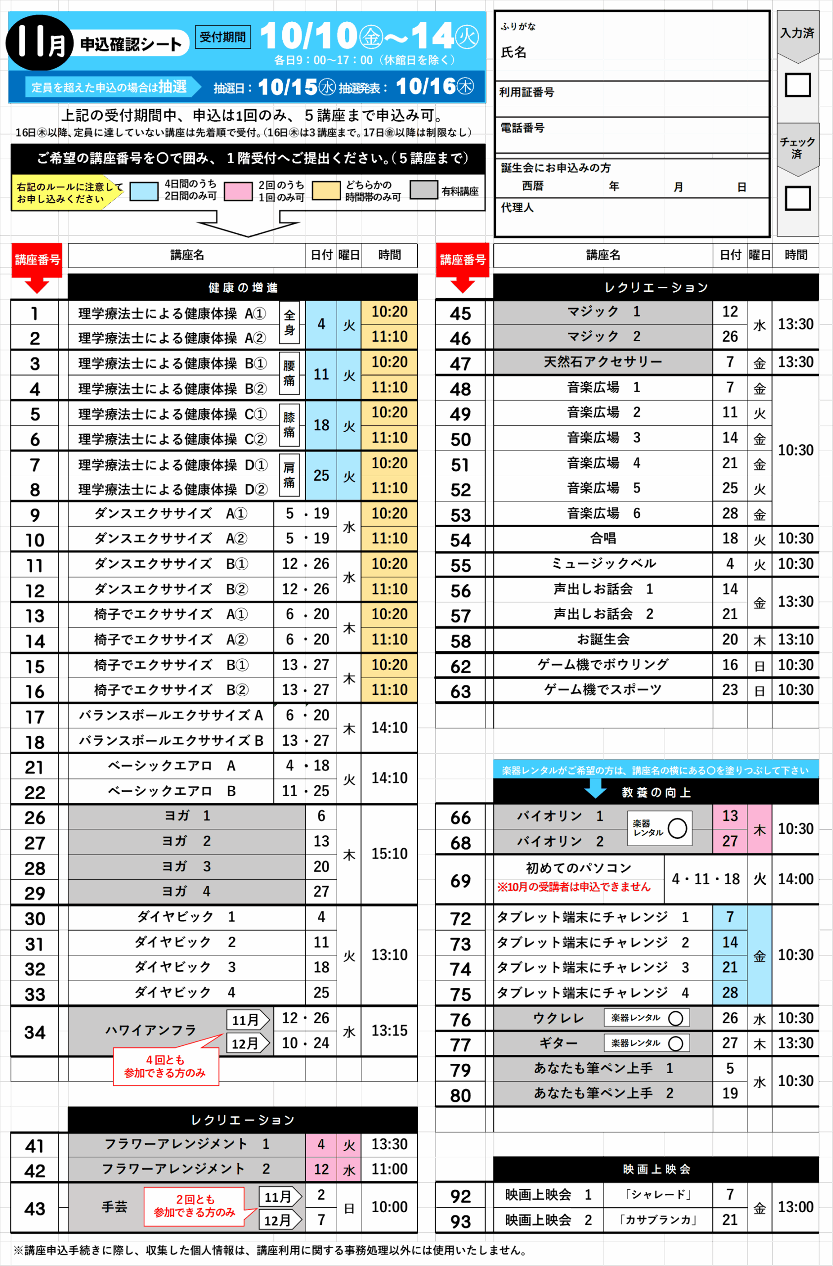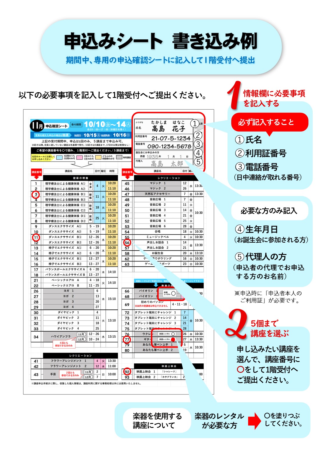 上記申込期間中に、専用の申込確認シートに5つまで希望する講座を選んで講座の番号に〇をして、1階受付までご提出ください。コピーをお渡ししますので、抽選結果と照らし合わせるまで大切に保管してください。