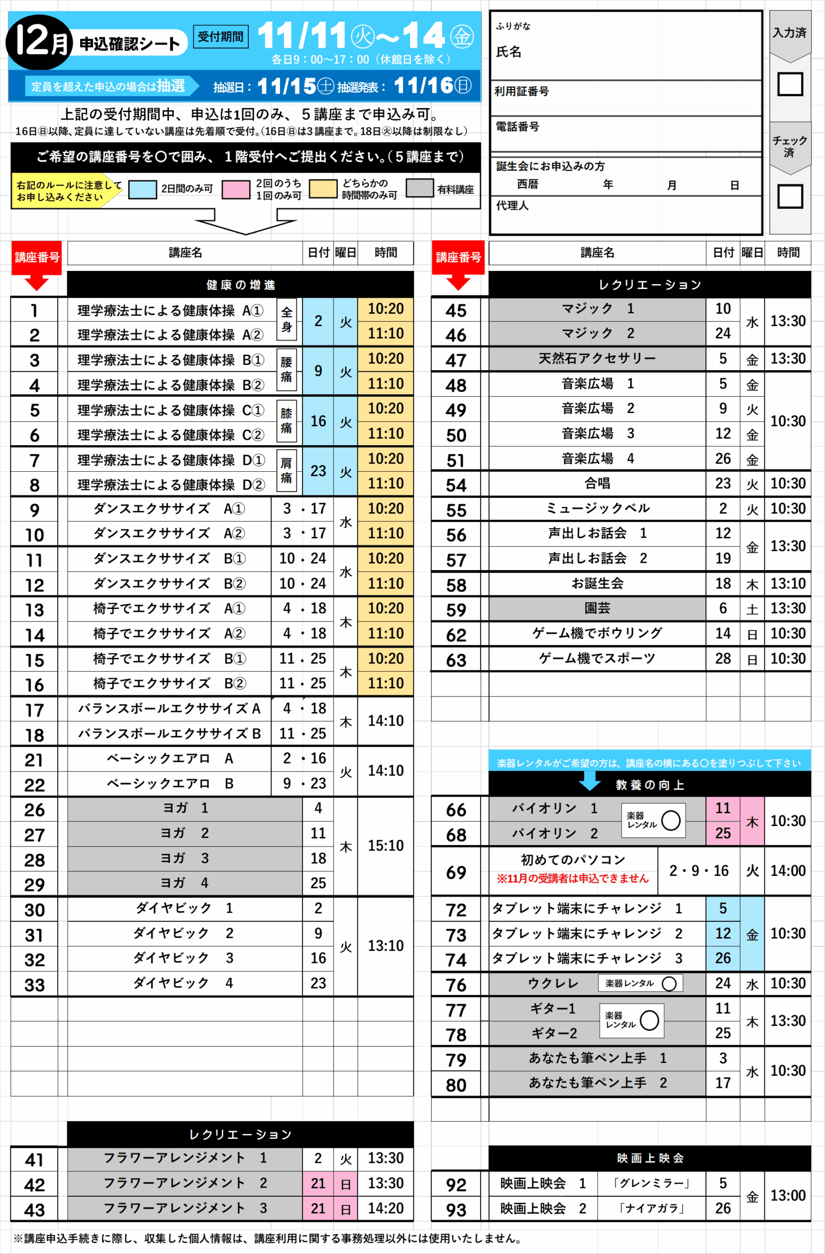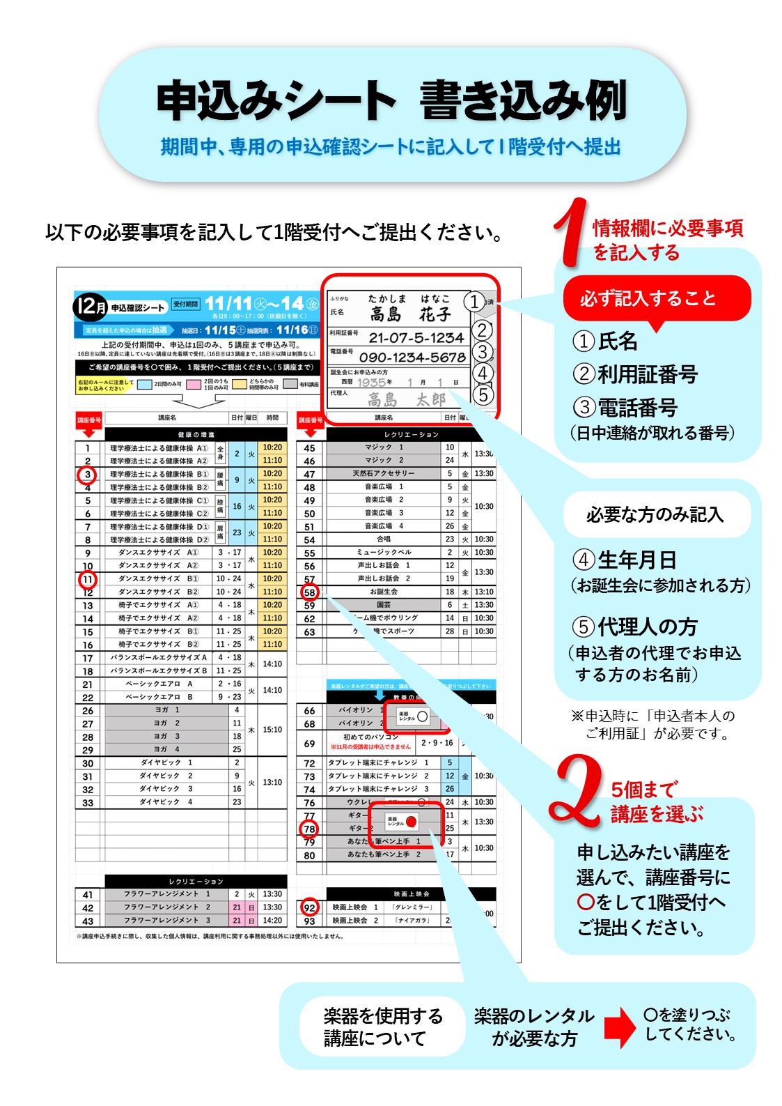 上記申込期間中に、専用の申込確認シートに5つまで希望する講座を選んで講座の番号に〇をして、1階受付までご提出ください。コピーをお渡ししますので、抽選結果と照らし合わせるまで大切に保管してください。